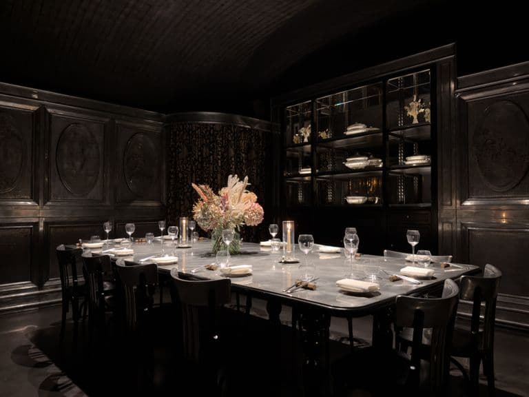 La sala si rivela come un'estensione nascosta del ristorante, pensata per creare un senso di transizione dallo spazio principale verso una dimensione più privata e immersiva, dove l'esperienza diventa più concentrata e rarefatta.
